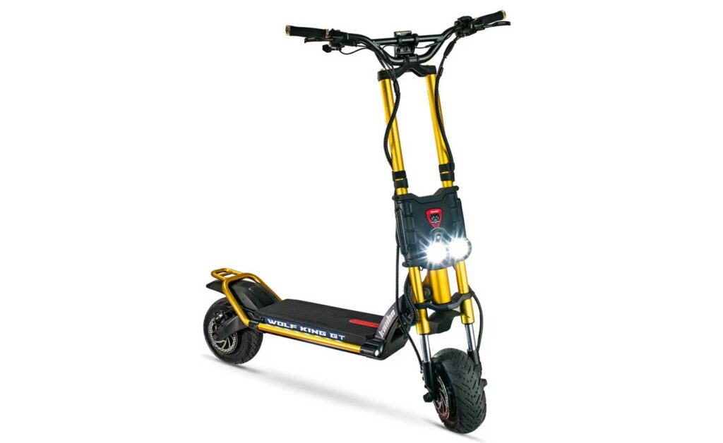 Under your feet, the King GT's got an enormous rubberized deck, motorcycle-grade suspension on the front, and serious spring suspension on the rear. Kaabo Wolf King GT Pro The Kaabo Wolf King GT Pro premium electric scooter is built to go further, faster Its unparalleled 50-degree climbing ability and advanced suspension system ensure a smooth ride on any terrain